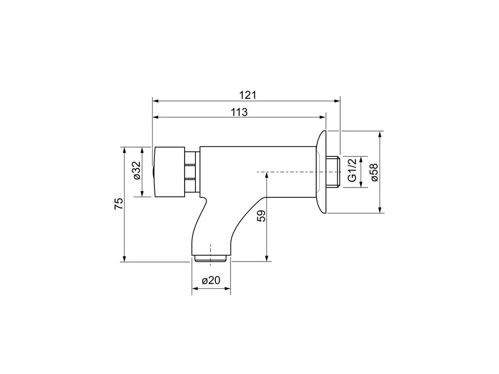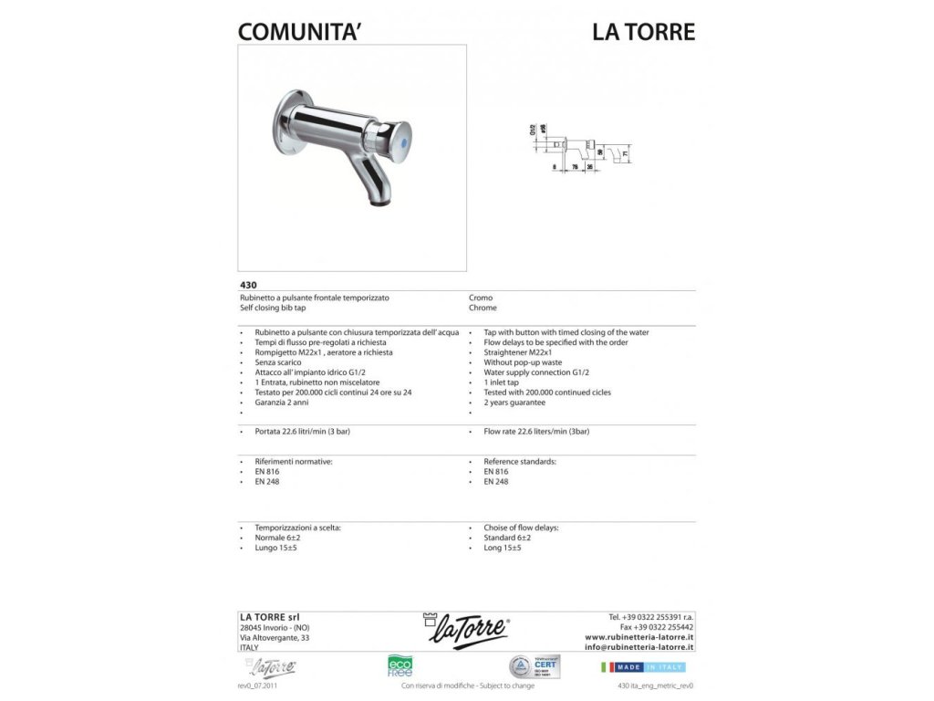 Samouzatvárací stenový prietokový ventil značky La Torre. Vybavený je perlátorom M22x1. Bez pop-up odpadu.
