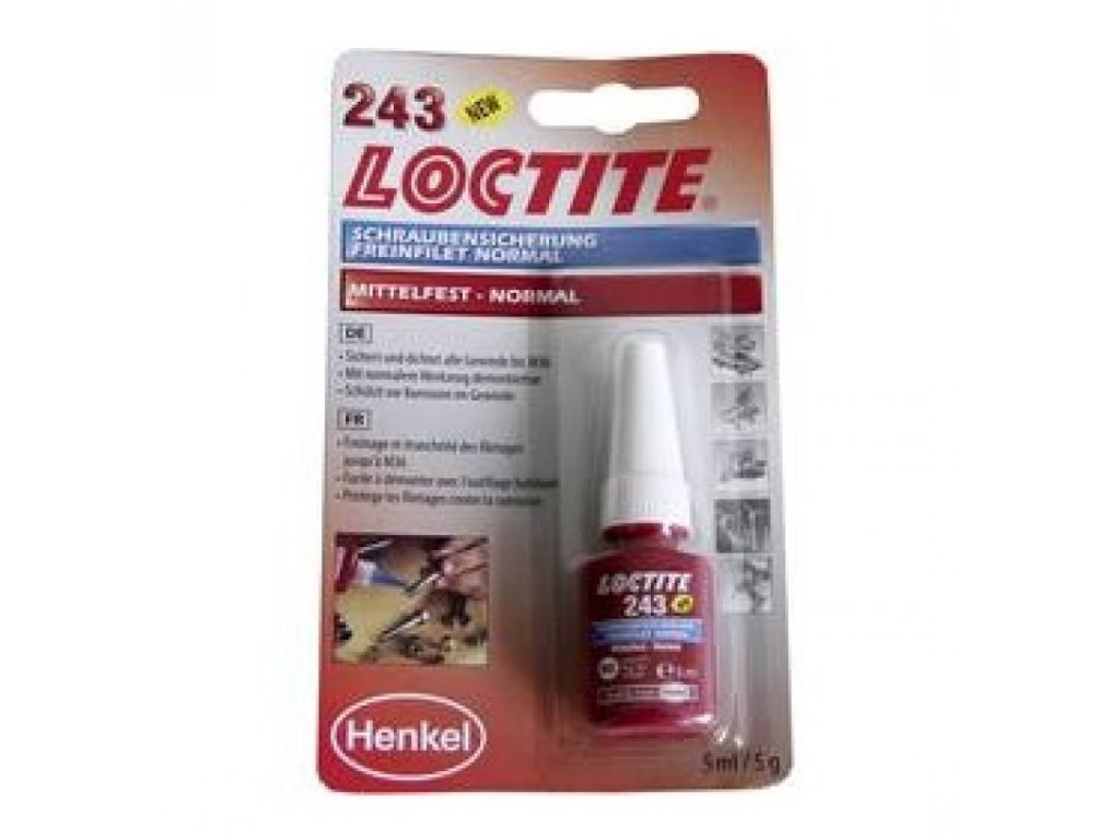 Loctite 243 tmel pre zaisťovanie závitov, matíc a šróbov proti samovoľnému uvoľneniu. Je určený pre zais´tovanie a utesňovanie závitových spojov, ktoré majú byť demontovateľné bežným ručným náradím. Vytvrdzuje bez prístupu vzduchu a zabraňuje uvoľneniu či presakovaniu spoja, spôsobené vibráciami a rázmi.