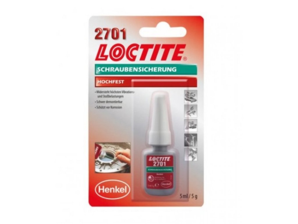 Loctite 2701 vysokopevný tmel pre trvalé zaisťovanie a tesnenie závitových spojov. Produkt vytvrdzuje bez prístupu vzduchu v špáre medzi lepenými kovovými povrchmi a zabraňuje uvoľneniu či presakovaniu spojov, ktoré je spôsobené vibráciami a nárazmi.