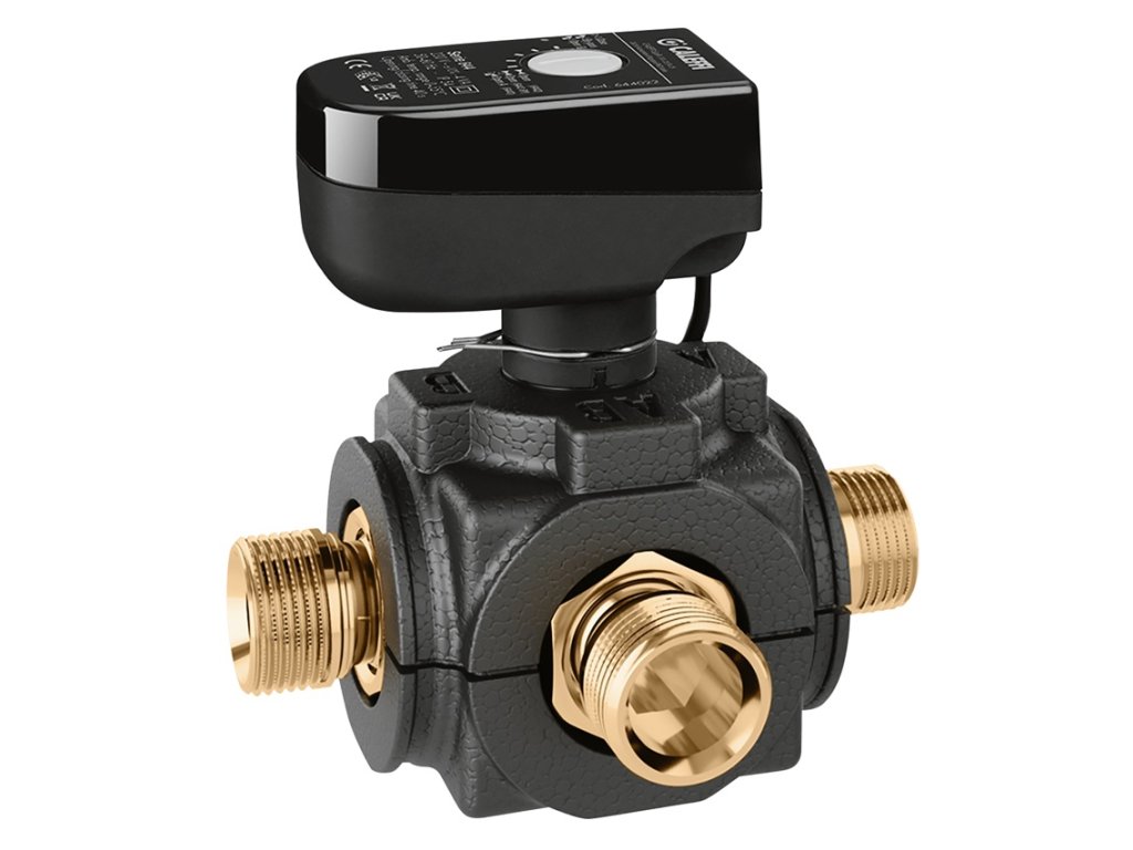 Trojcestný guľový ventil značky Caleffi, so servopohonom a s prídavným mikrospínačom.