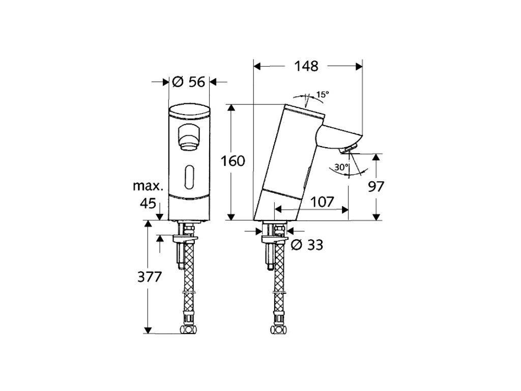• infračervený senzor armatúry s jedným otvorom: infračervený elektronický senzor programovateľný, magnetický ventil 6 V s predfiltrom, perlátor, priehradka na batériu 6 V (integrovaná)