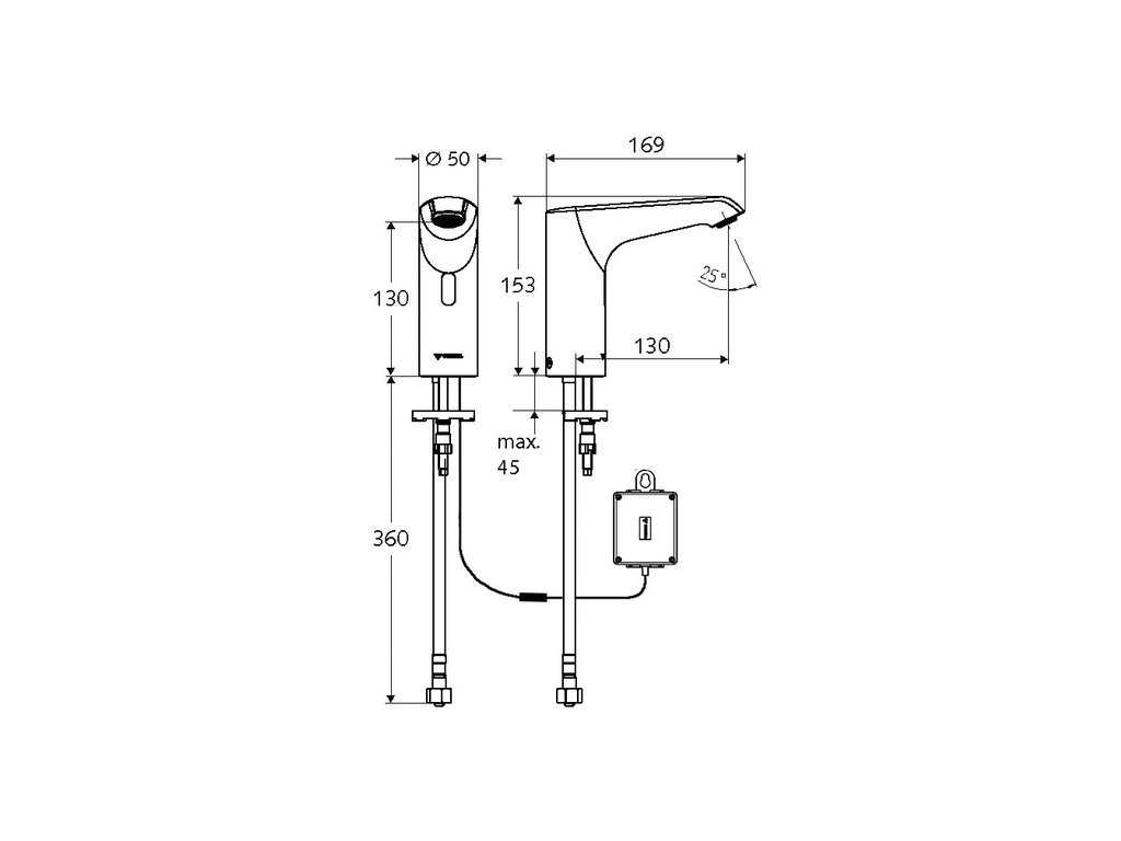 • infračervený senzor armatúry s jedným otvorom: infračervený elektronický senzor programovateľný, axiálny magnetický ventil 6 V s predfiltrom, perlátor, pripojovací kábel 220 mm, s konektorom 3pólovým, trieda ochrany IP 65