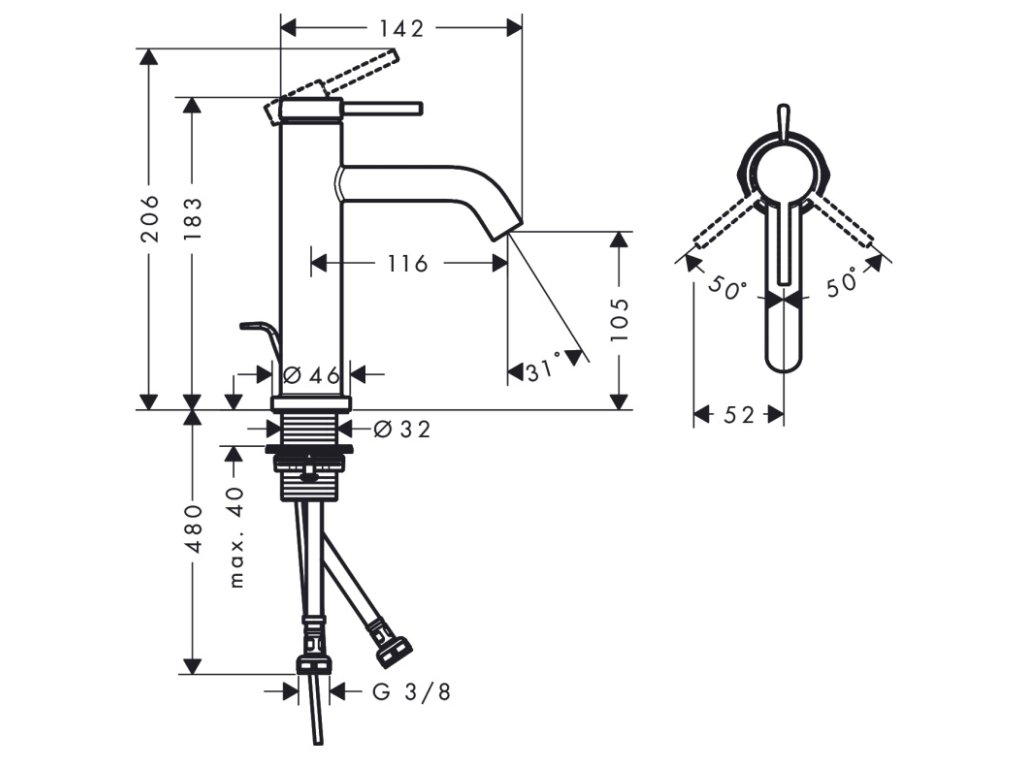 Umývadlová batéria TECTURIS S značky Hansgrohe. S odtokovou súpravou s tiahlom, G 1.