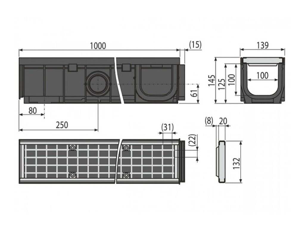 Vonkajší žľab 100mm s plastovým rámom a pozinkovaným roštom B125