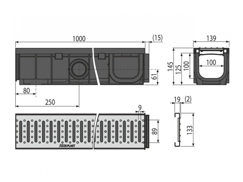 Vonkajší žľab 100mm s plastovým rámom a pozinkovaným roštom "C" profilu A15