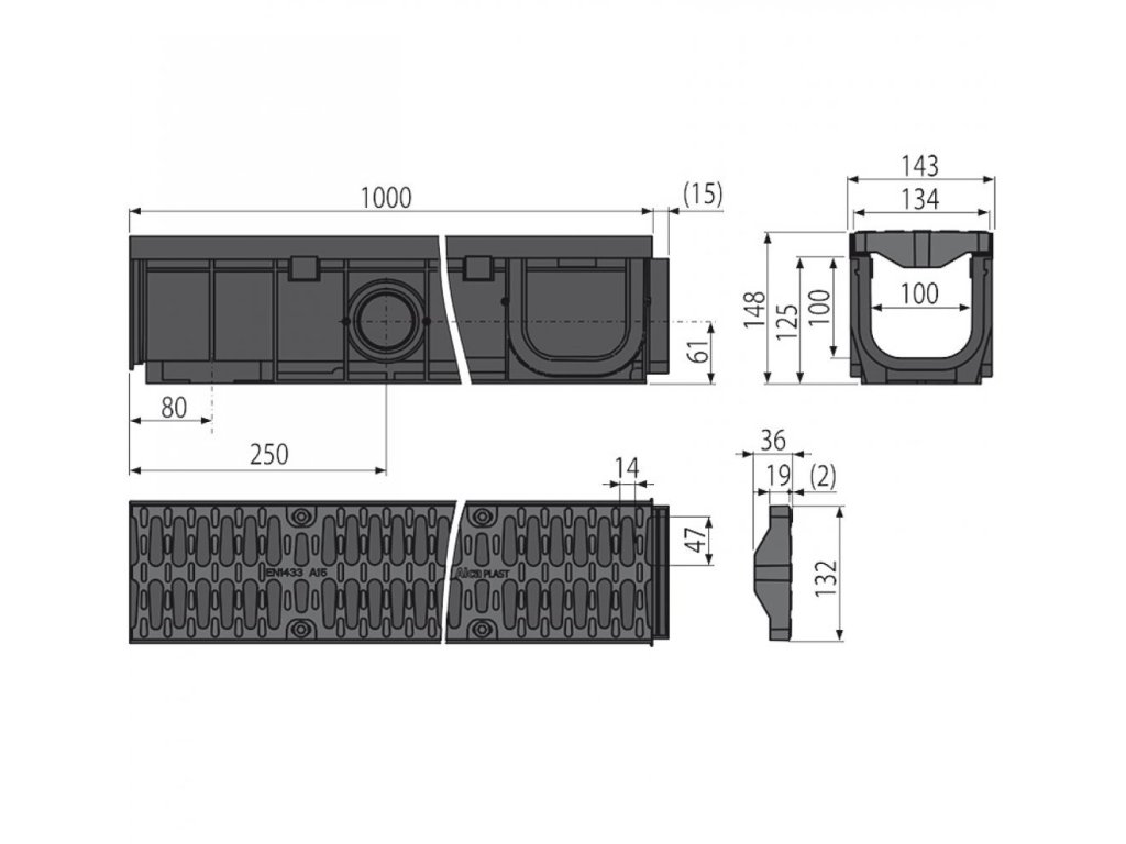 Rošt plastový – fixovaný v žľabe pomocou ôsmich kusov nerezových skrutiek, šírka vtokovej štrbiny 14 mm