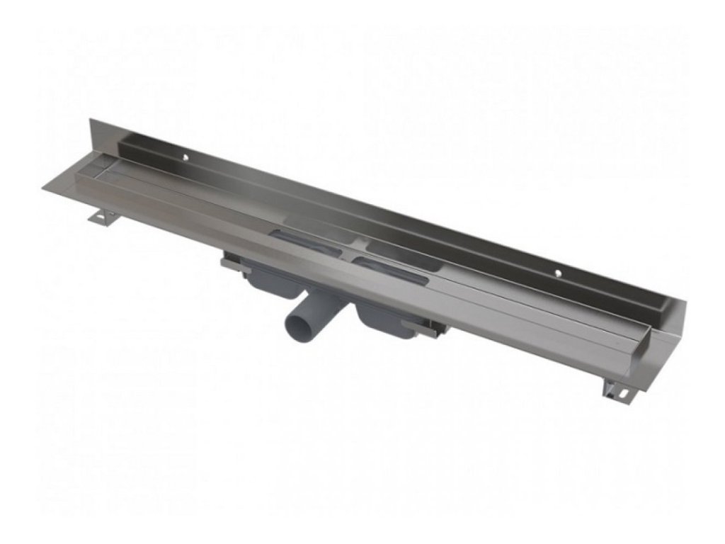 Wall Low - podlahový žľab značky Alcaplast, s okrajom pre plný rošt a s pevným límcom ku stene.